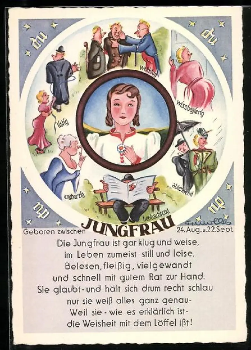 Künstler-AK Die Jungfrau ist gar klug und weise..., Sternzeichen, Horoskpo, Astrologie