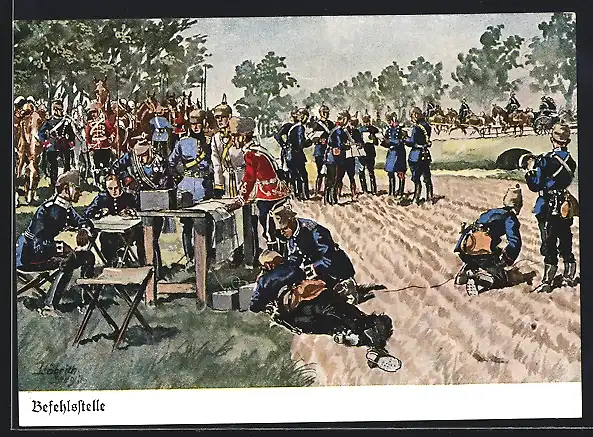 Künstler-AK Döbrich-Steglitz: Befehlsstelle, Offiziere und Funker