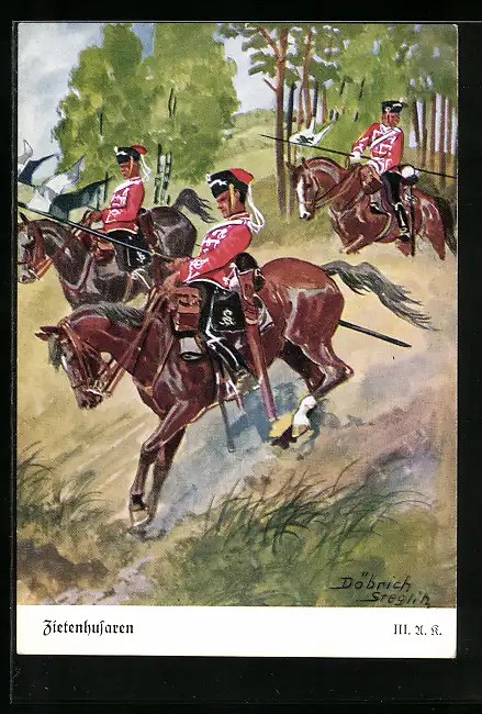 Künstler-AK Döbrich-Steglitz: Zietenhusaren reiten einen Hang hinab