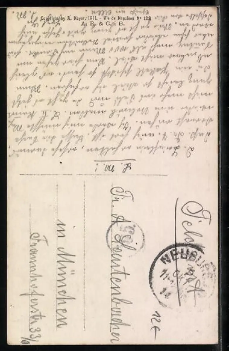 Personenbezogene Daten auf der Rückseite der Karte wurden durch blauen Textmarker unkenntlich gemacht. Die blauen Stellen sind auf die Vorderseite durchgeweicht und wirken sich negativ auf das Postkartenfoto aus