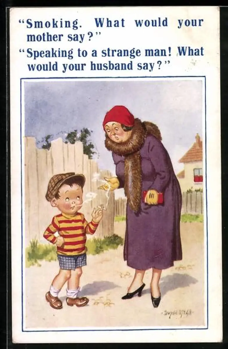 Künstler-AK Donald McGill: Dame wundert sich über ein rauchendes Kind