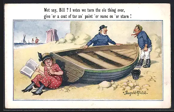 Künstler-AK Donald McGill: Frau am Strand erschreckt vor zwei Matrosen