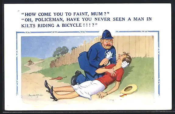Künstler-AK Donald McGill: Have you never seen a man in kilts riding a bicycle?, Polizist und ohnmächtige Frau