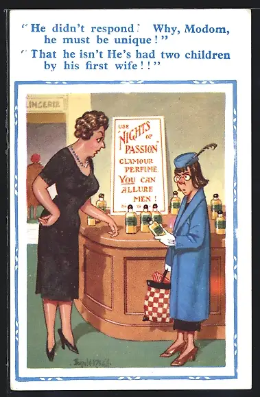 Künstler-AK Donald McGill: He didn`t respond?..., Parfum zum Anlocken von Männern funktioniert nicht
