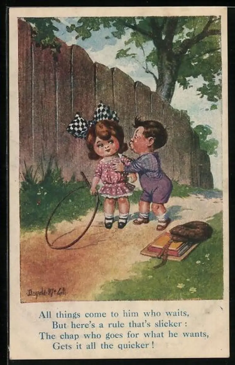 Künstler-AK Donald McGill: Junge küsst ein Mädchen auf einem Feldweg