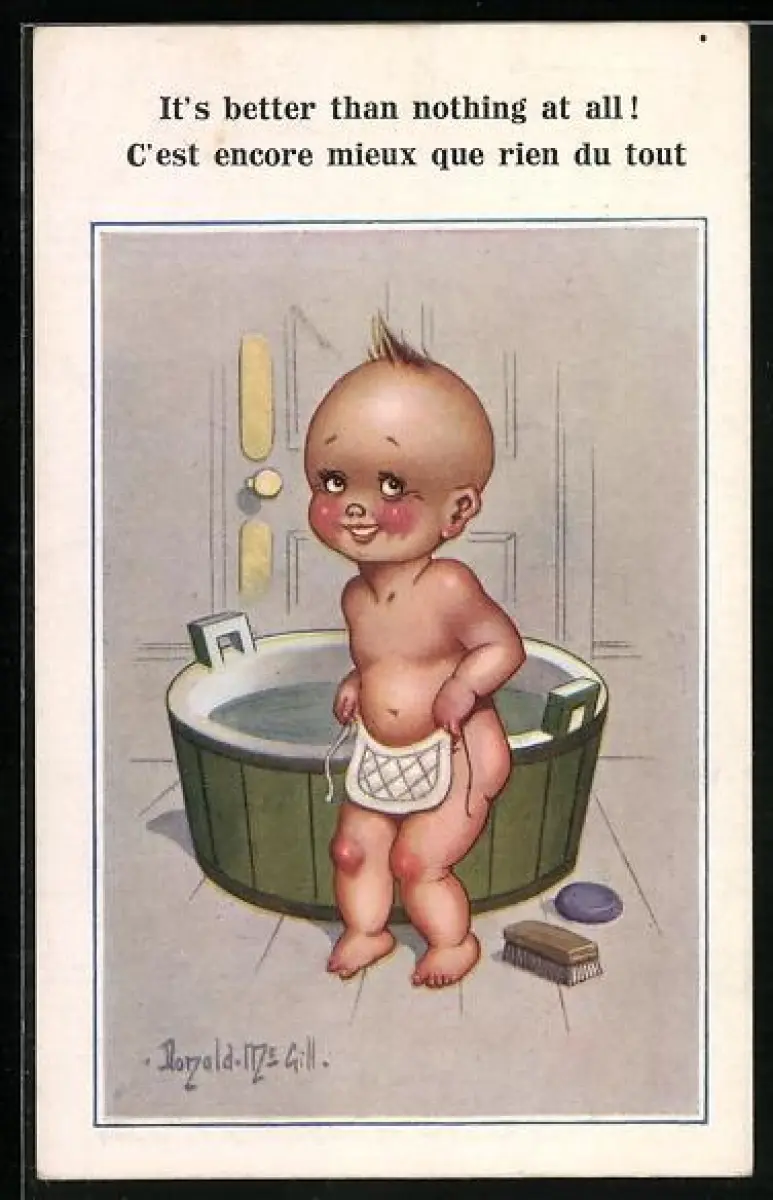 Künstler-AK Donald McGill: Kind steigt aus der Badewanne