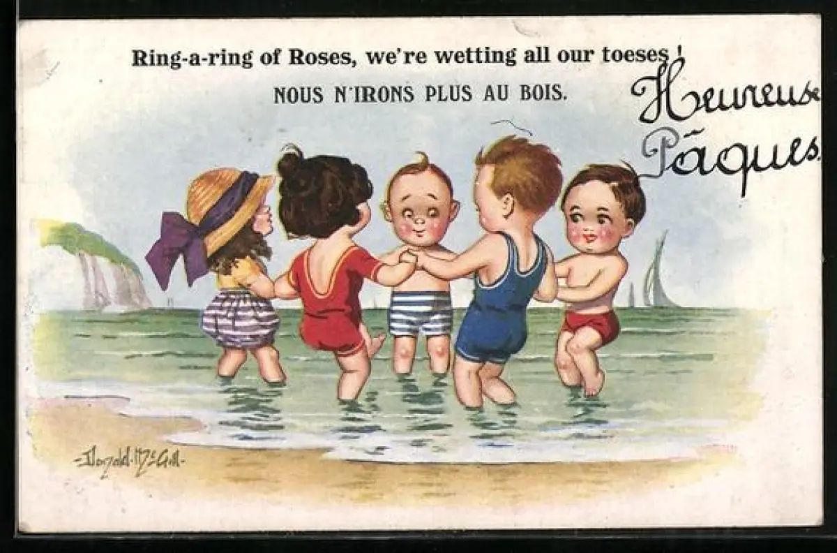 Künstler-AK Donald McGill: Kinder tanzen im Meer Ringelreihen