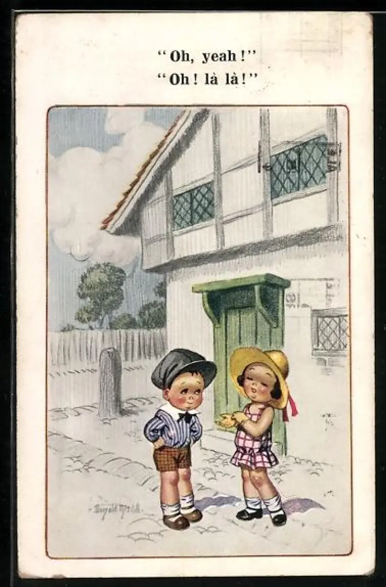 Künstler-AK Donald McGill: Kleines Pärchen vor einem Fachwerkhaus