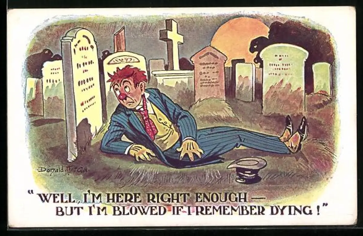 Künstler-AK Donald McGill: Mann wacht auf dem Friedhof auf