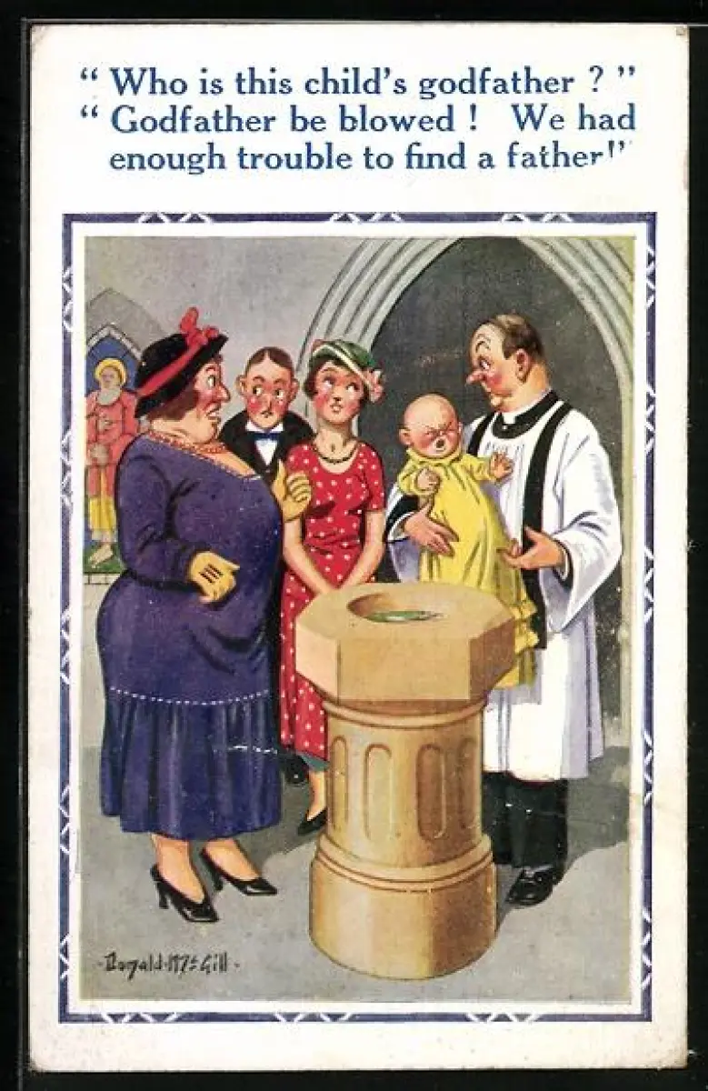 Künstler-AK Donald McGill: Pfarrer fragt nach dem Paten eines Kindes