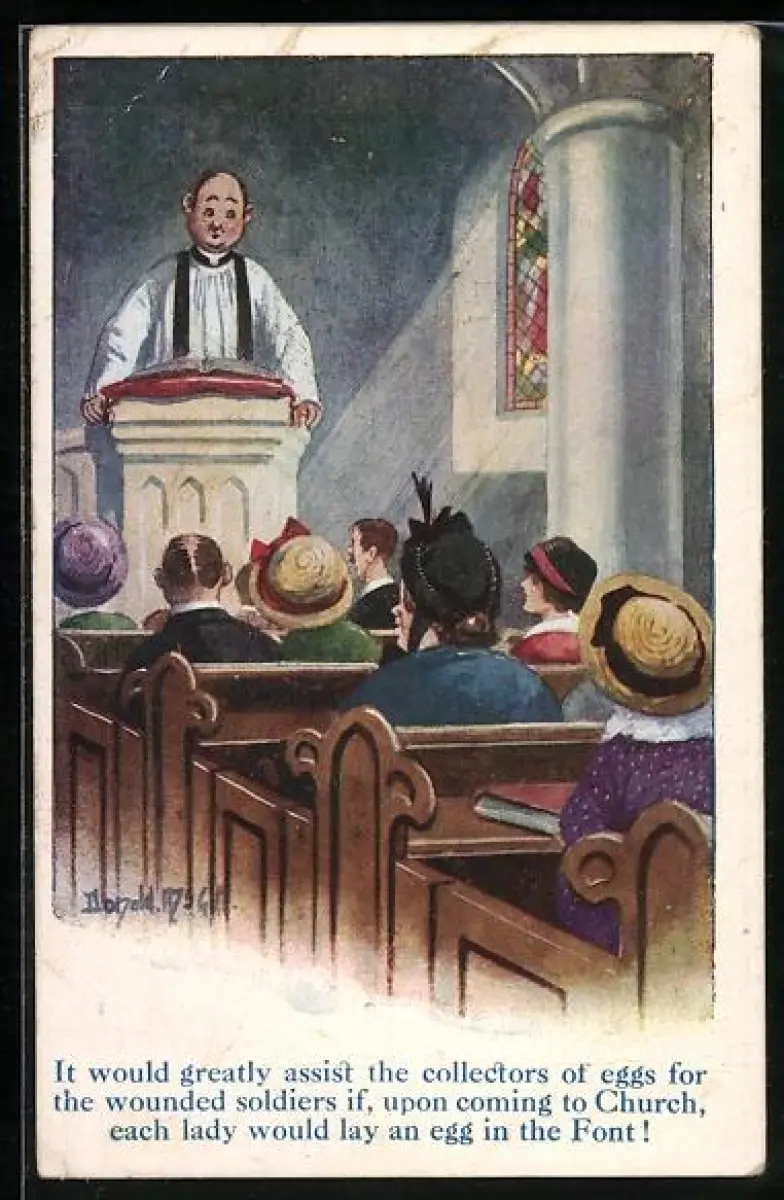 Künstler-AK Donald McGill: Pfarrer ruft die Gemeinde zu Spenden auf
