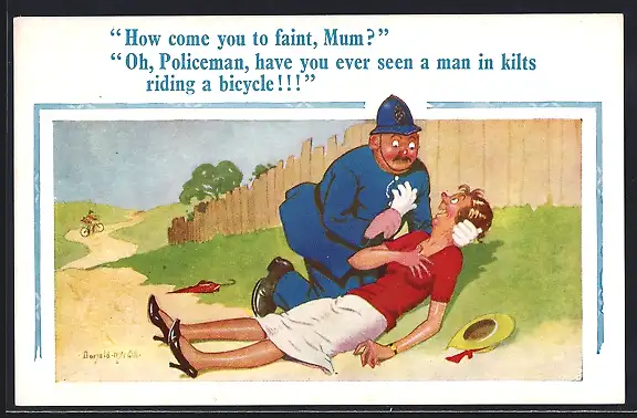 Künstler-AK Donald McGill: Polizist hilft ohnmächtiger Frau am Strassenrand