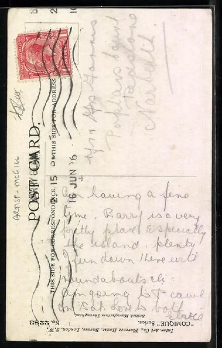 Personenbezogene Daten auf der Rückseite der Karte wurden durch blauen Textmarker unkenntlich gemacht. Die blauen Stellen sind auf die Vorderseite durchgeweicht und wirken sich negativ auf das Postkartenfoto aus