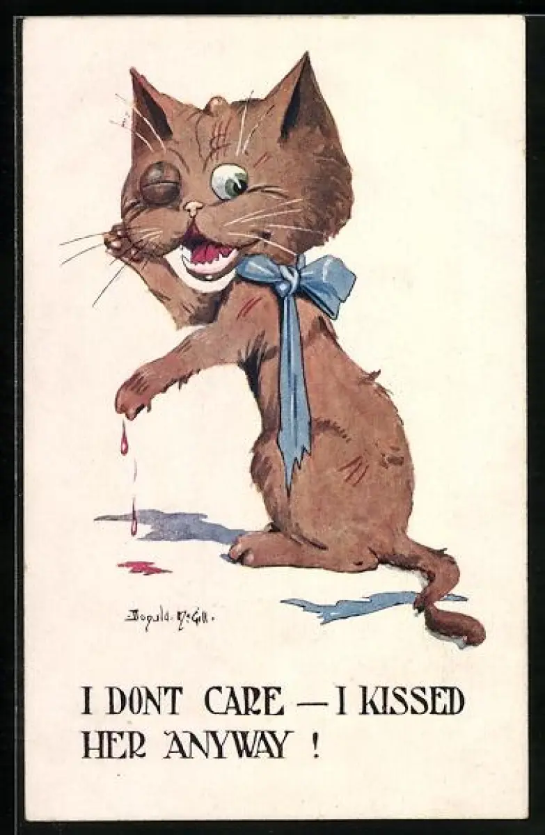 Künstler-AK Donald McGill: Zerkratzter Kater nach einem Gefecht