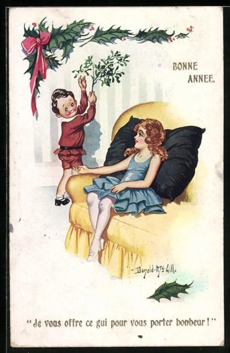 Künstler-AK Donald McGill: Zwei Kinder feiern Neujahr, Stechpalme und Mistelzweig