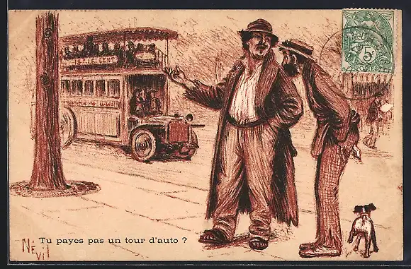 Künstler-AK Doppeldeckerbus, Zwei Männer reden über eine Busfahrt