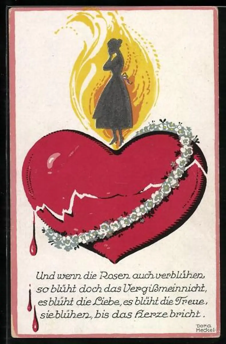 Künstler-AK Dora Heckel: Frau in den Flammen eines brennenden Herzens