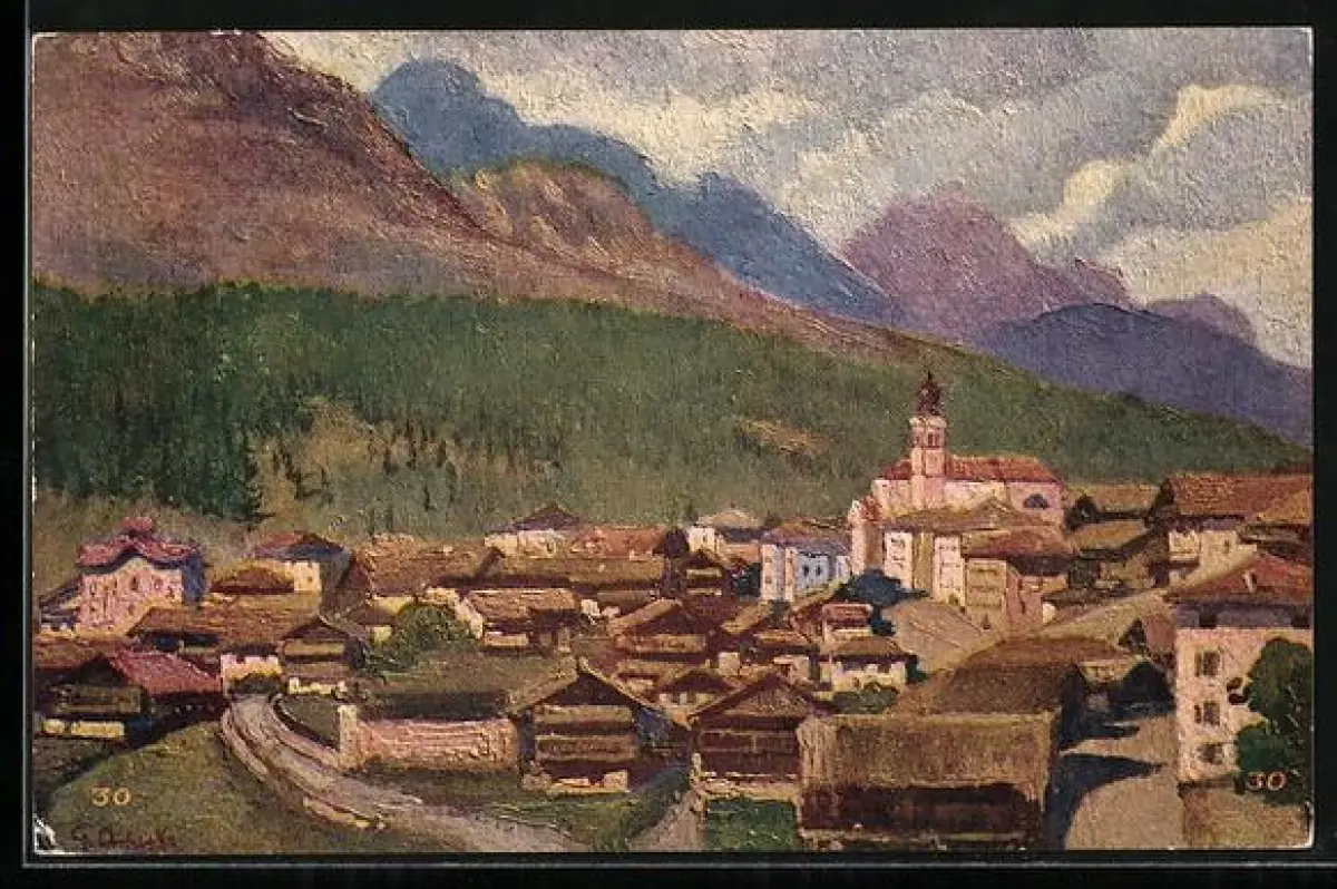 Künstler-AK Dosoledo, Ortsansicht mit Monte Popera