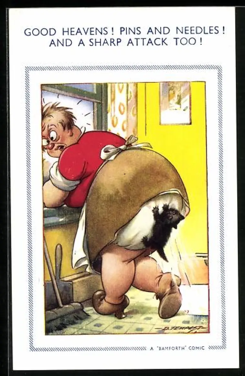Künstler-AK Douglas Tempest: Kleine schwarze Katze krallt sich am Hintern einer Frau fest