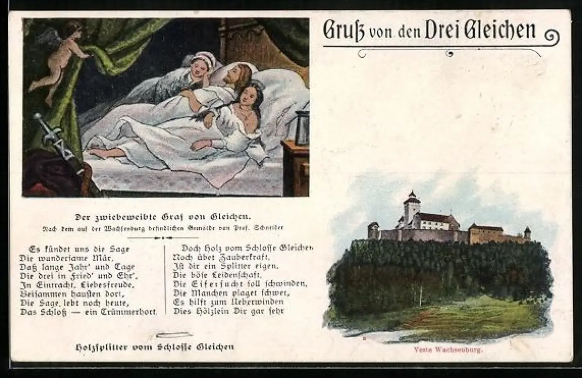 Künstler-AK Drei Gleichen, Vesste Wachsenburg, Der zwiebeweibte Graf von Gleichen, Holzsplitter vom Schlosse Gleichen