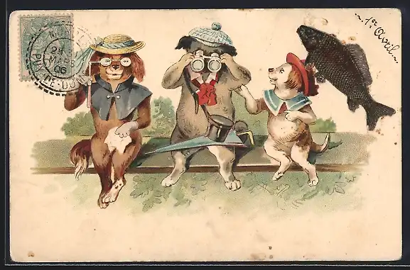 Künstler-AK Drei Hunde auf einer Bank mit aufgeklebtem Fisch