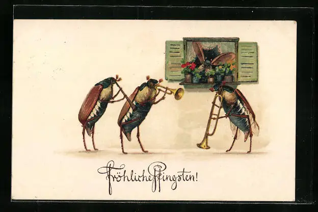 Künstler-AK Drei Maikäfer geben ein Ständchen für eine Maikäfer-Dame, Pfingstgruss