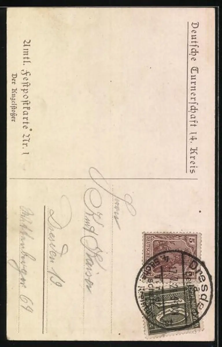 Künstler-AK Dresden, 3. Sächsisches Kreisturnfest 1921, Sportler beim Kugelstossen