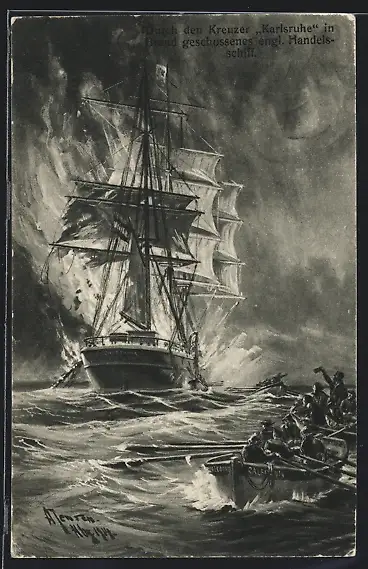 Künstler-AK Durch den Kreuzer Karlsruhe in Brand geschossenes engl. Handelsschiff, Kriegsschiff