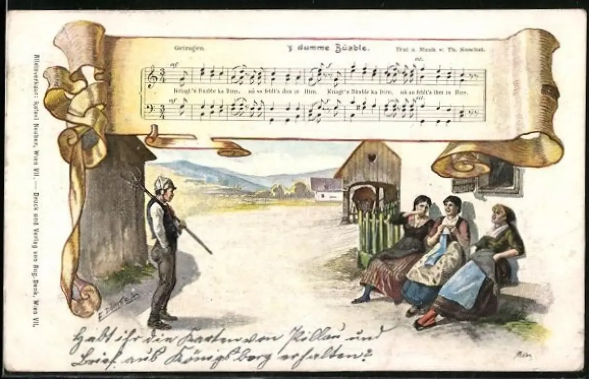 Künstler-AK E. Döcker: Frauen in Trachten beim Tuscheln über einen Bauern mit Mistgabel, Liedzeilen