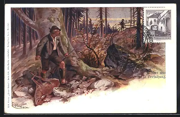 Künstler-AK E. Döcker: Führe uns nicht in Versuchung, Jäger mit einem erlegtem Reh