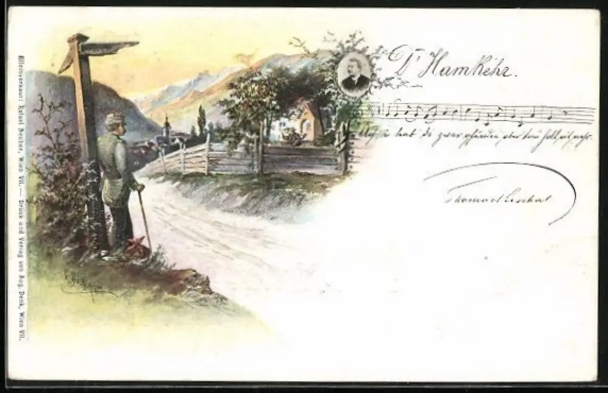 Künstler-AK E. Döcker: ein Wanderer steht an einem Wegweiser, Lied: D`Hamkehr