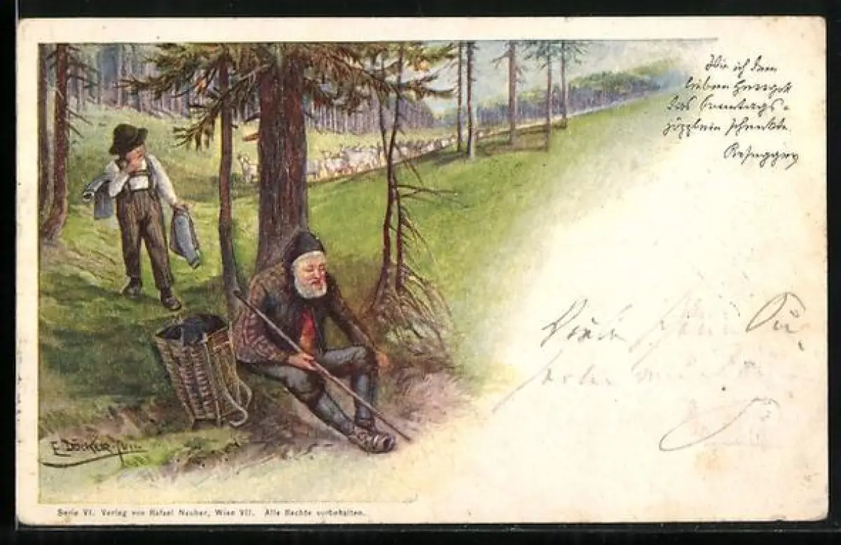 Künstler-AK E. Döcker: kleiner Schafhirte begegnet einem Wanderer im Wald