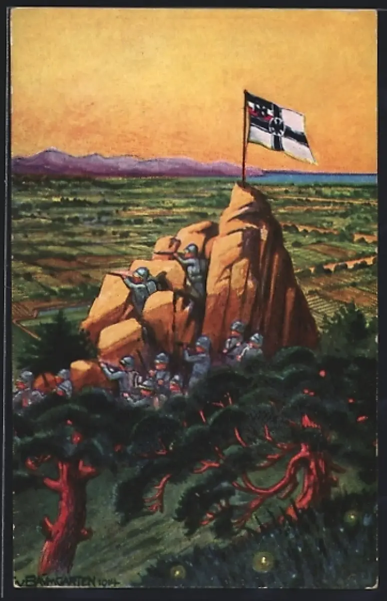 Künstler-AK E. v. Baumgarten: Auf Beobachtungsposten vor Tsingtau, Kolonialkriegerdank, Ostasiengeschwader