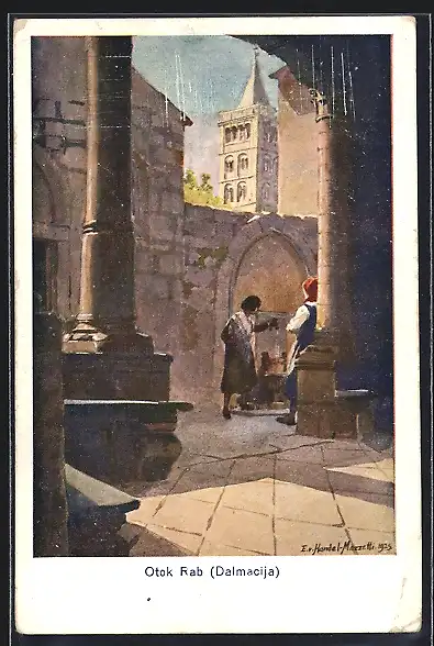 Künstler-AK Edo v. Handel-Mazzetti: Otok Rab, Ortspartie mit Anwohnern an einer kleinen Wasserstelle