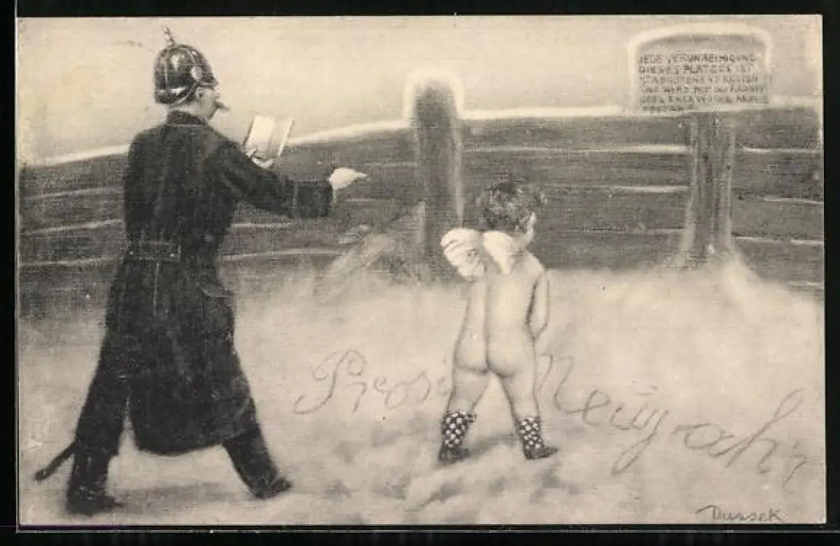 Künstler-AK Eduard Adrian Dussek: Engel pinkelt Prosit Neujahr in den Schnee, Polizist gibt Strafzettel