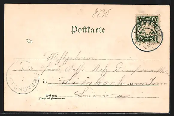 Personenbezogene Daten auf der Rückseite der Karte wurden durch blauen Textmarker unkenntlich gemacht. Die blauen Stellen sind auf die Vorderseite durchgeweicht und wirken sich negativ auf das Postkartenfoto aus