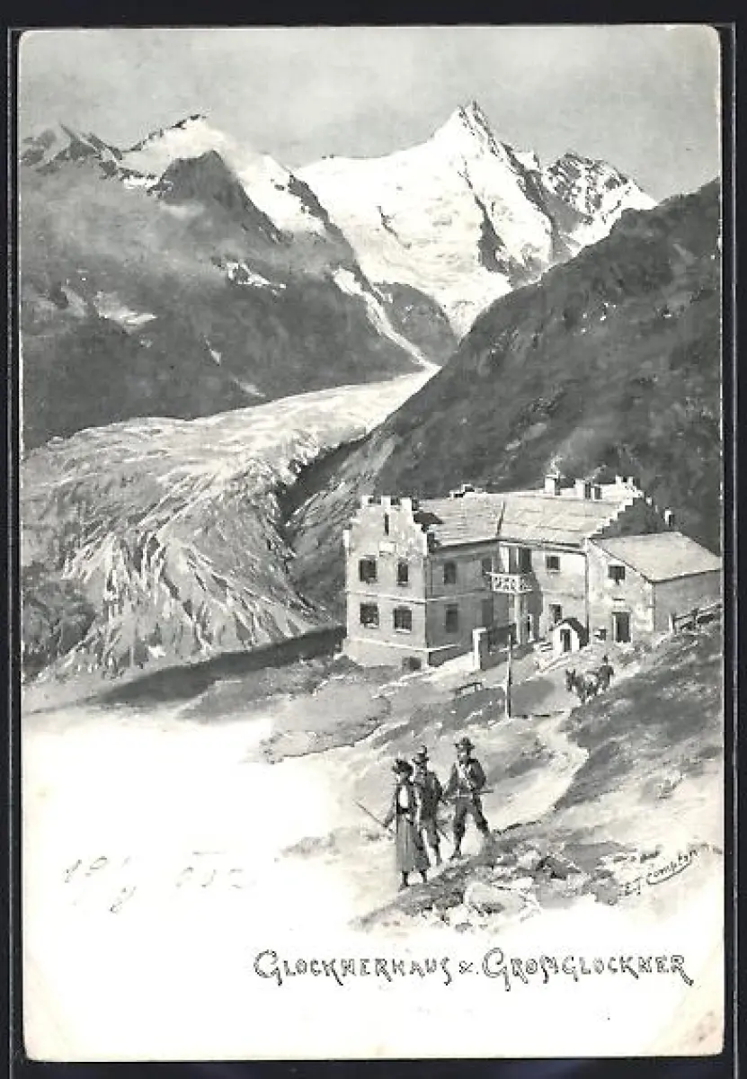 Künstler-AK Edward Theodore Compton: Glocknerhaus und Grossglockner mit Bergsteigern