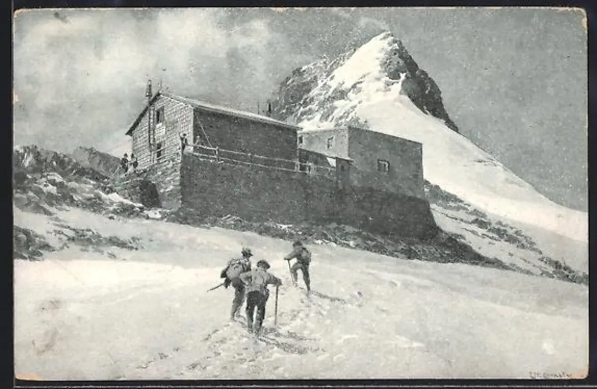 Künstler-AK Edward Theodore Compton: Grossglockner, Glocknerhaus auf der Elisabethruhe mit Wanderern