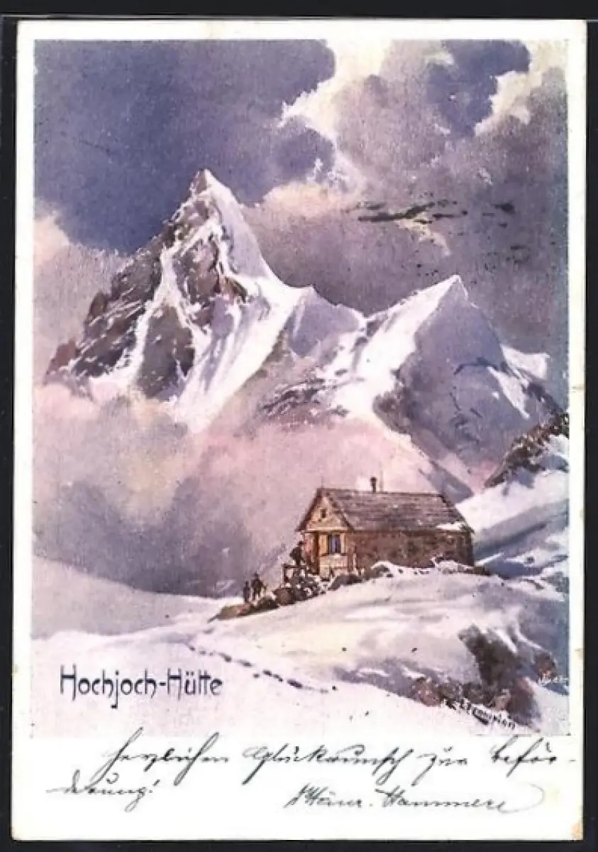 Künstler-AK Edward Theodore Compton: Hochjoch-Hütte, Berghütte im Winter
