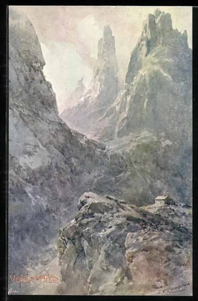 Künstler-AK Edward Theodore Compton: Vajolet-Hütte, Ansicht der Berge mit der Berghütte