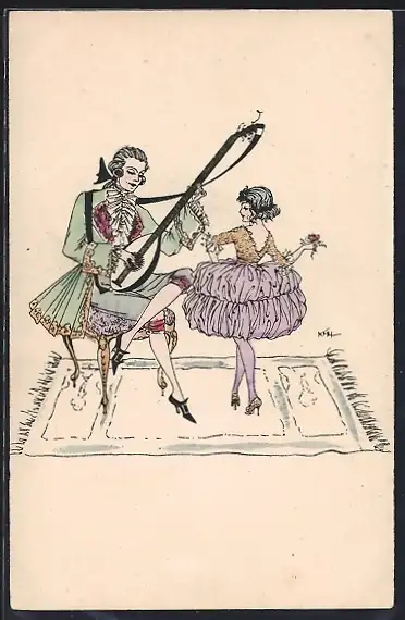 Künstler-AK Ein Mann spielt Musik und eine Frau tanzt, Jugendstil