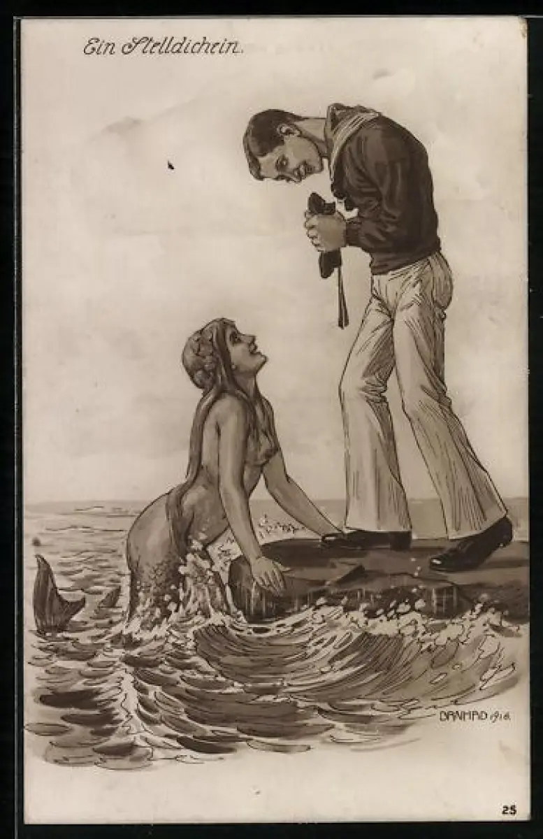 Künstler-AK Ein Stelldichein, Matrose begegnet einer Nixe