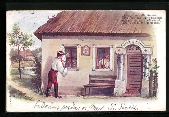 Künstler-AK Ein junger Mann in tschechischer Tracht klopft ans Fenster des Hauses einer Frau
