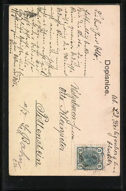 Personenbezogene Daten auf der Rückseite der Karte wurden durch blauen Textmarker unkenntlich gemacht. Die blauen Stellen sind auf die Vorderseite durchgeweicht und wirken sich negativ auf das Postkartenfoto aus