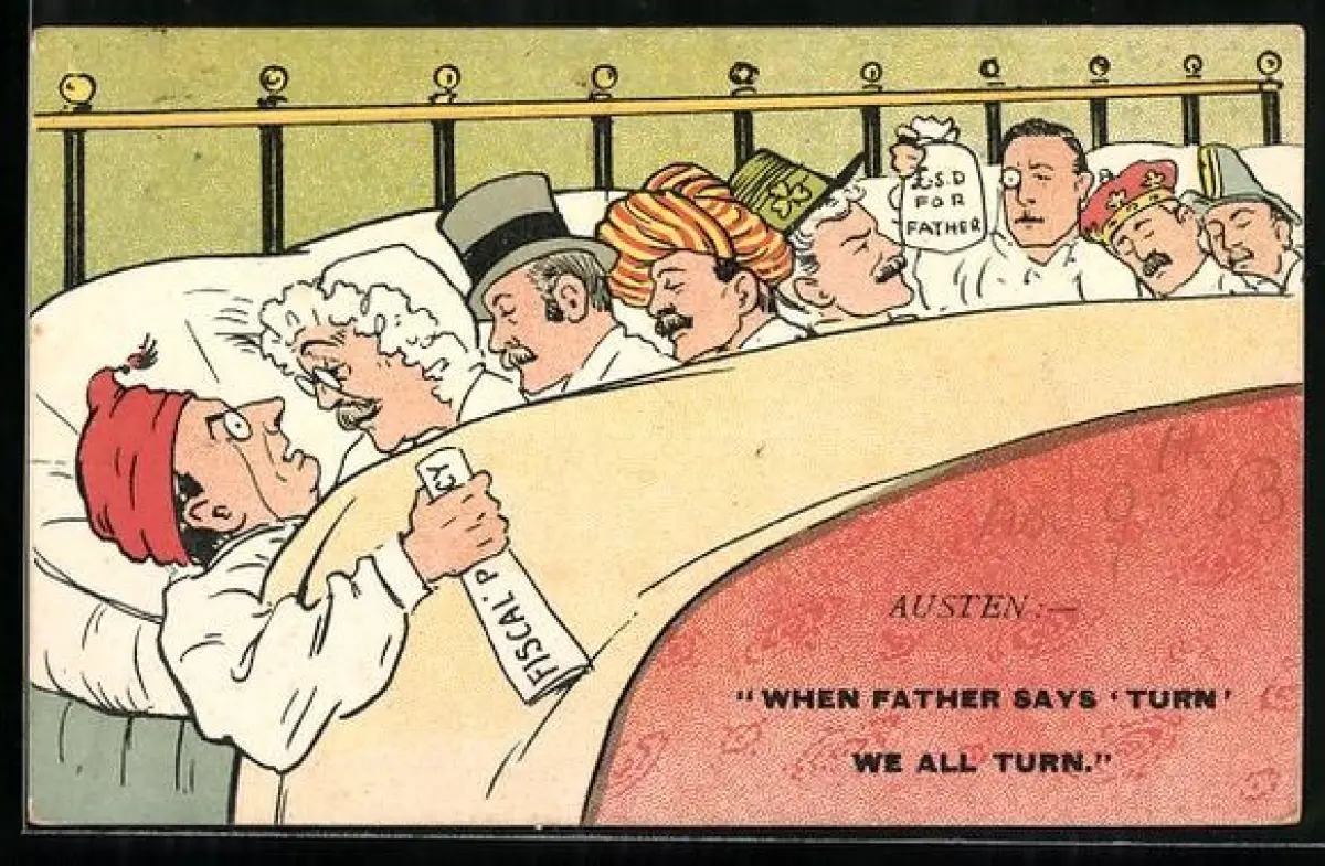Künstler-AK Eine Reihe Staatsoberhäupter teilt sich ein Bett, When Father says `turn`, we all turn
