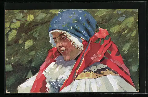 Künstler-AK Eine junge Dame in tschechischer Tracht mit blauem Kopftuch