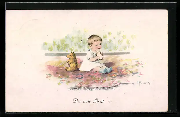 Künstler-AK Elly Frank: Ein kleines Kind mit Teddybär und einer Stulle