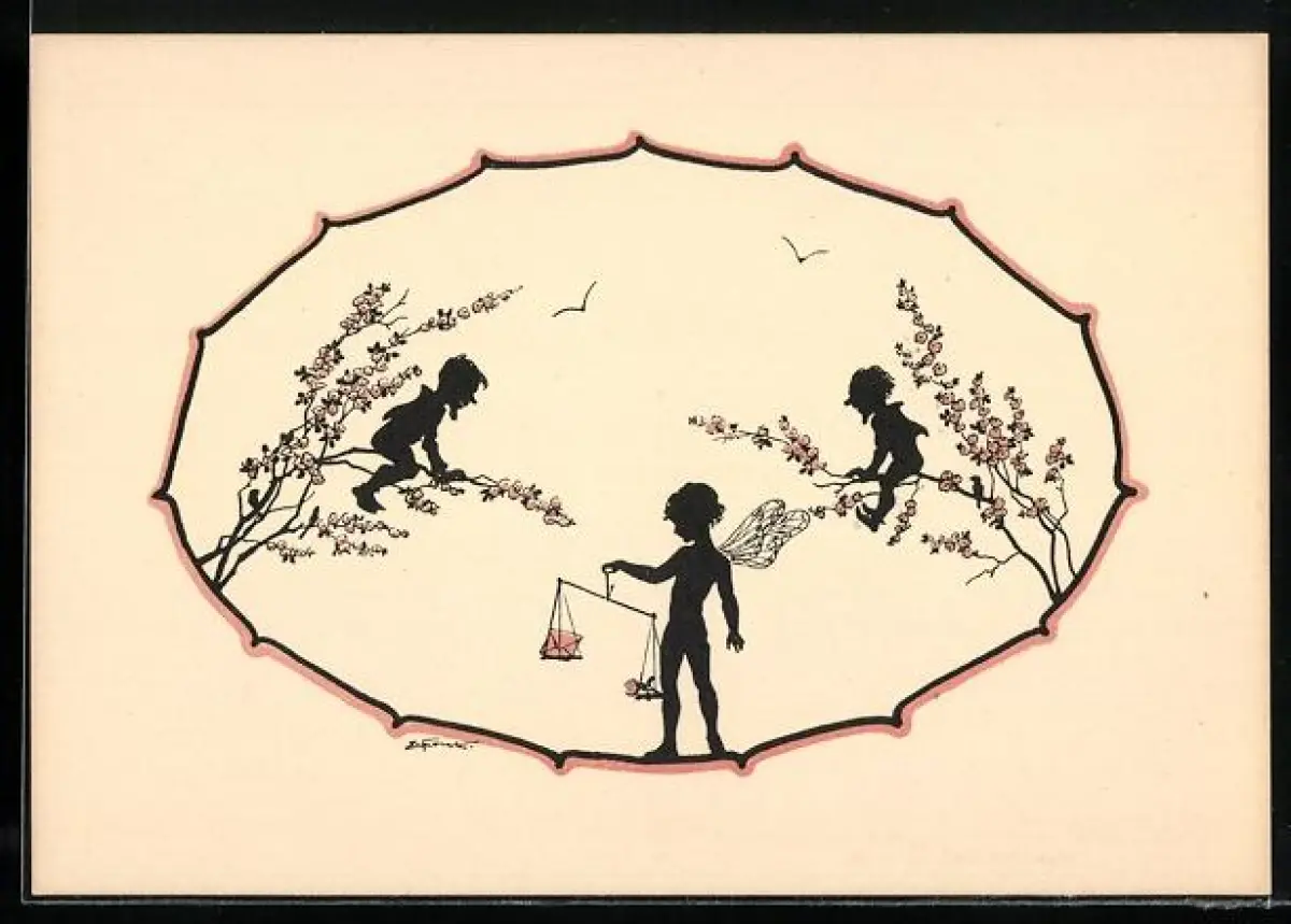 Künstler-AK Elsbeth Forck: Fee mit Waage, auf der ein Brief und eine Blume liegt