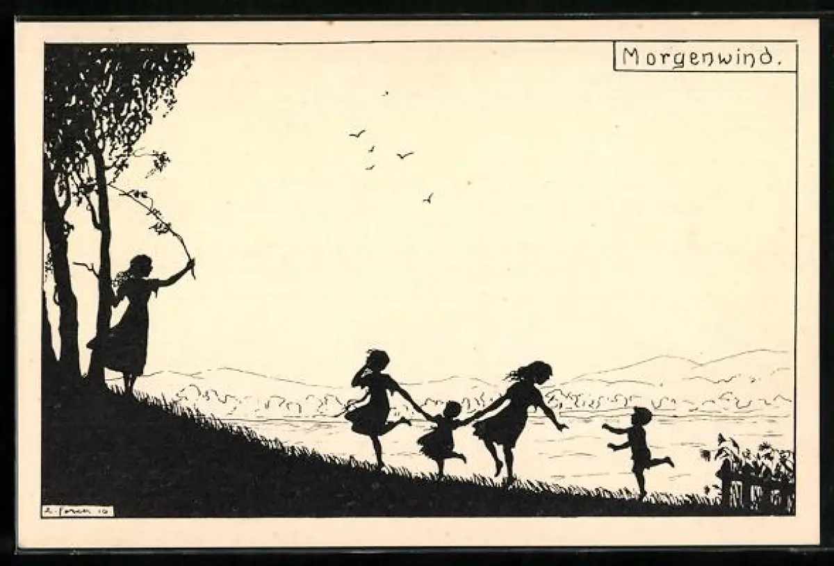 Künstler-AK Elsbeth Forck: Kinder auf einer Wiese spielend, Schattenbild