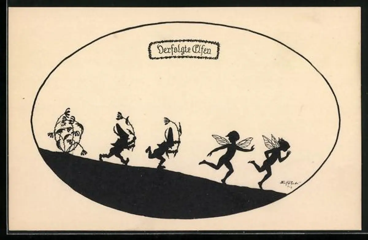 Künstler-AK Elsbeth Forck: Schattenbilder, Verfolgte Elfen, Zwerge